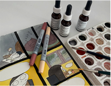 The entire comic is created analog—each panel is drawn and painted by hand, with only the lettering and final text added digitally after scanning. This tactile process is central to the feel of the work, giving it a raw, expressive texture that matches the emotional tone of the story.